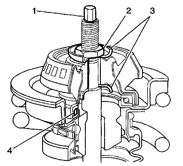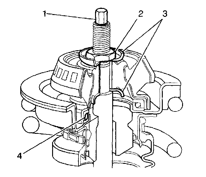 14. Install the strut bearing (4) to the upper spring seat in the same orientation as in the removal procedure.