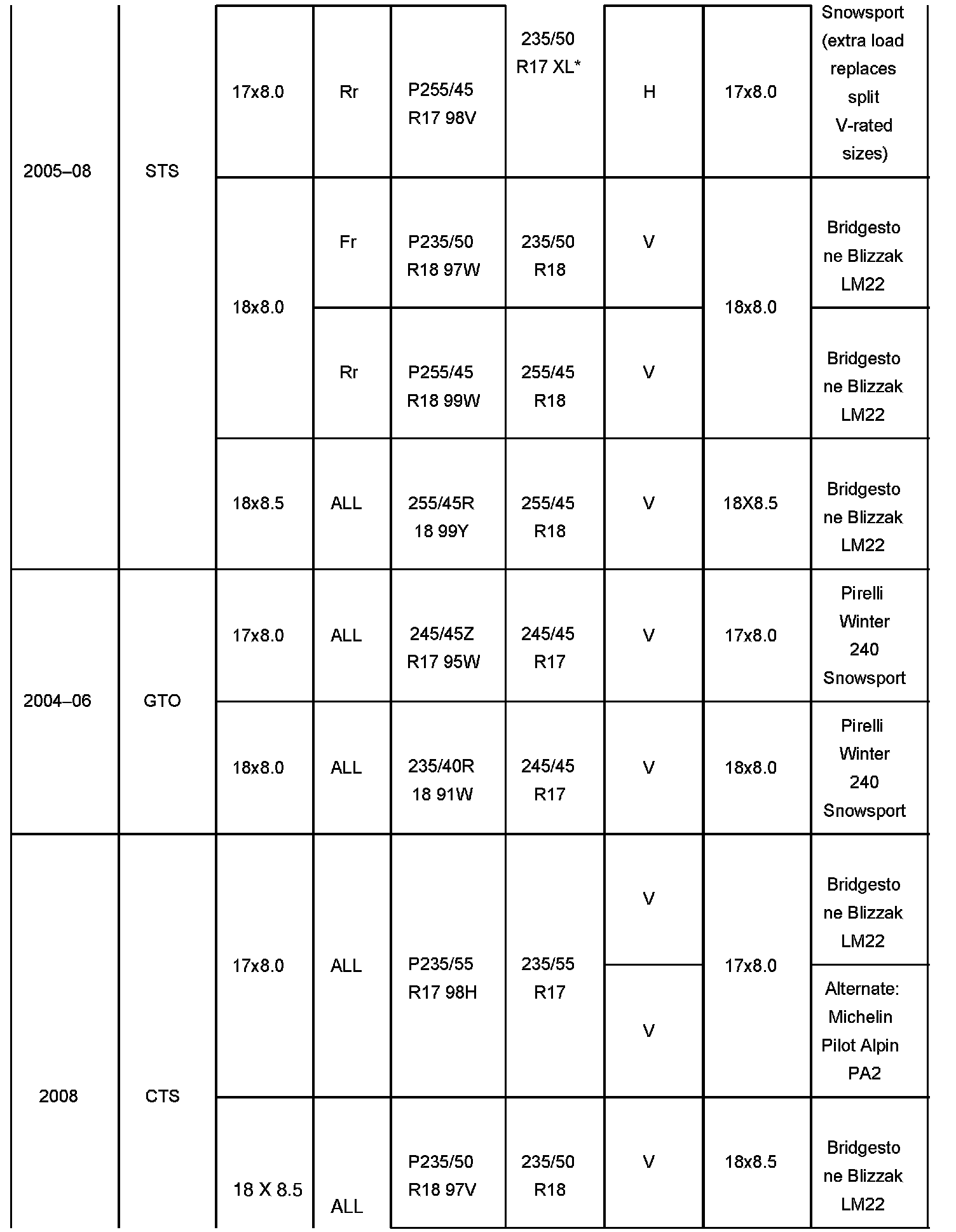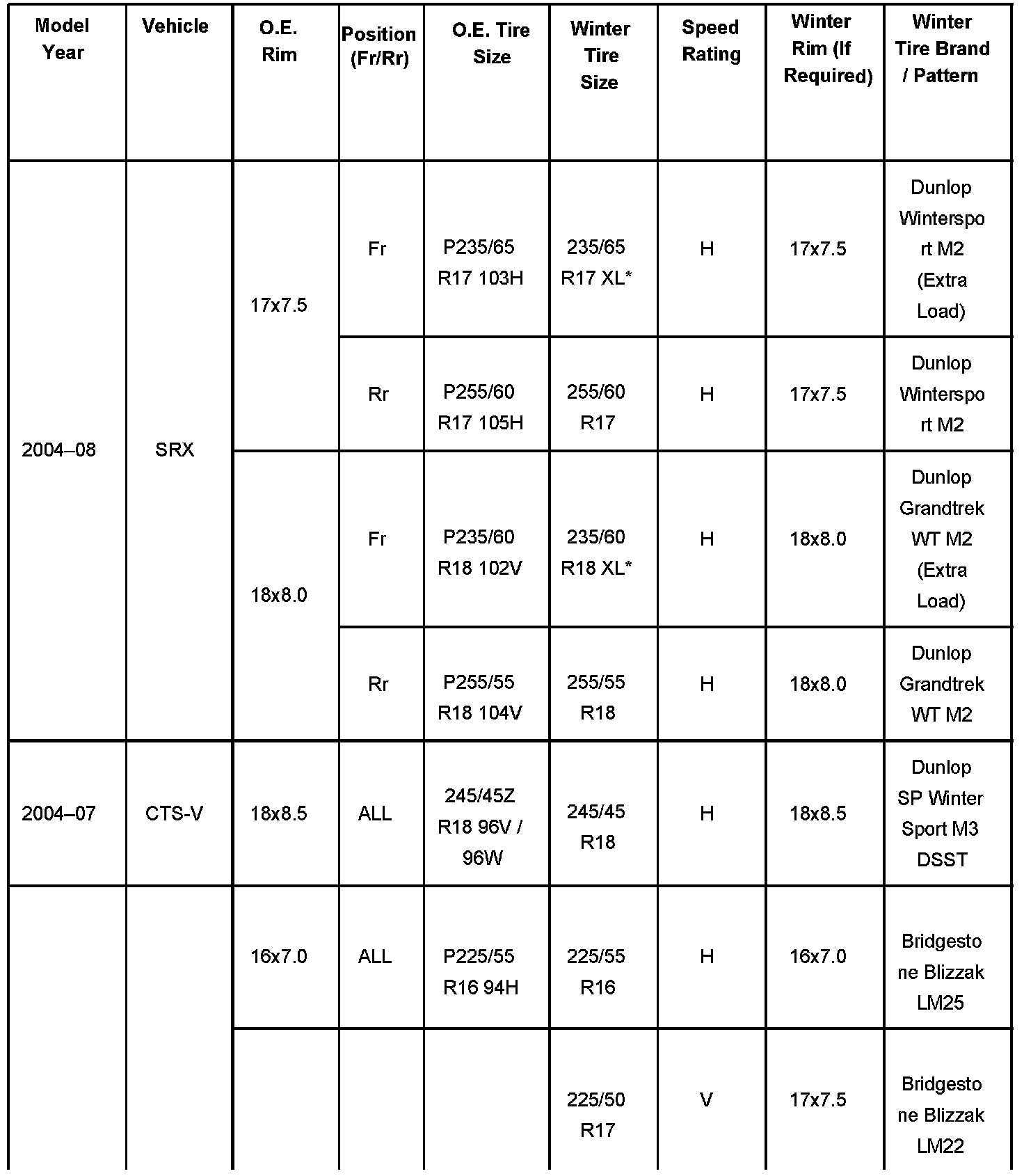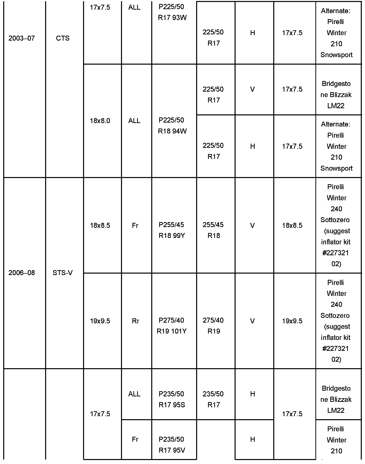 The tires shown are available for order through the GM Goodwrench Tire Program. Some tires may specify revised load ratings and/or recommended pressures. Please note STS-V recommended winter tires are not run-flat tires. Customers may wish to purchase inflator kit GM # 22732102 when using these tires.