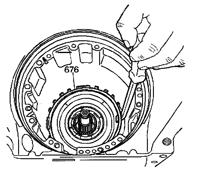 Important: Align the opening of the low and reverse clutch support retainer ring (676) with the wide low and reverse clutch support notch and the wide case lug.