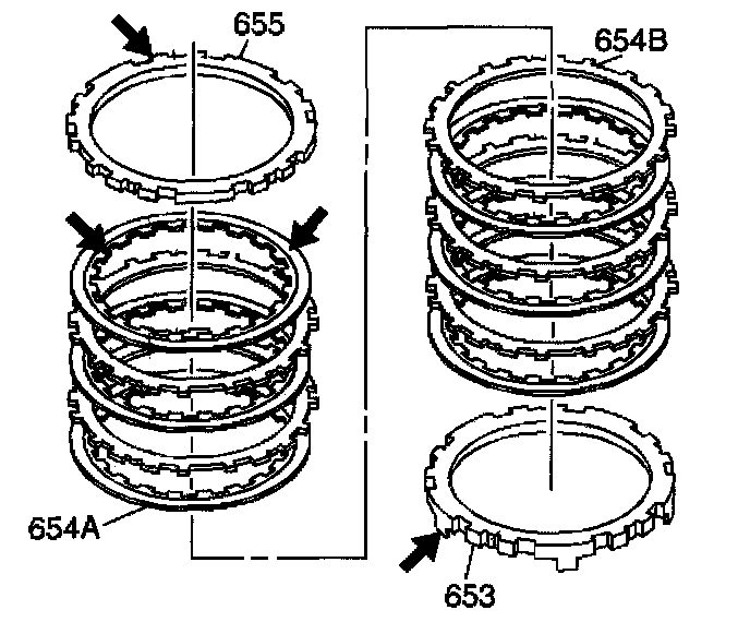 Installation Procedure1. Inspect the 3rd and 4th clutch apply plate (653), the fiber plate assemblies (654A), the steel plates (65413) and the selective backing plate (655) for the following conditions: