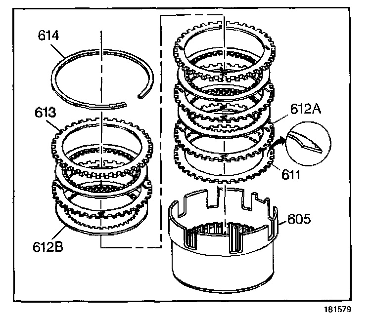 10. Inspect the belleville plate (611), the fiber plate assemblies (612B), the steel turbulator plates (612A) and the selective backing plate (613) for the following items: