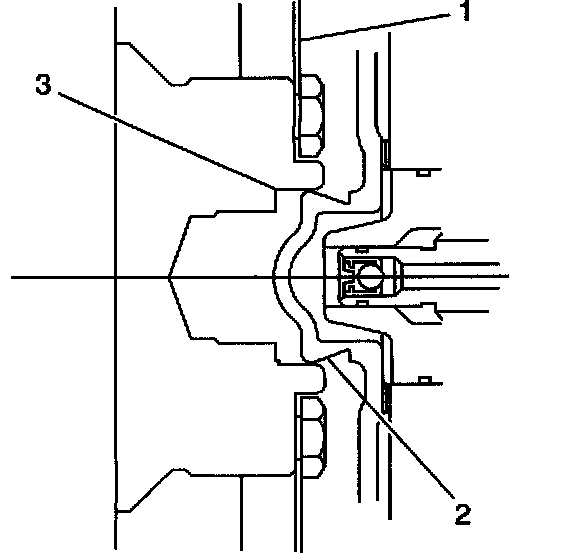 3. Align the torque converter hub (2) in the engine crankshaft (3) and install the torque converter to flywheel bolts.