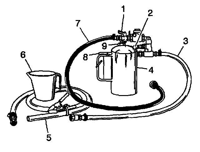 3. Install the fill cap (9) on the J 35944-A and pressurize the Flusher tank (4) to 550-700 kPa (80-100 psi), using the shop air supply at the tank air valve (2).