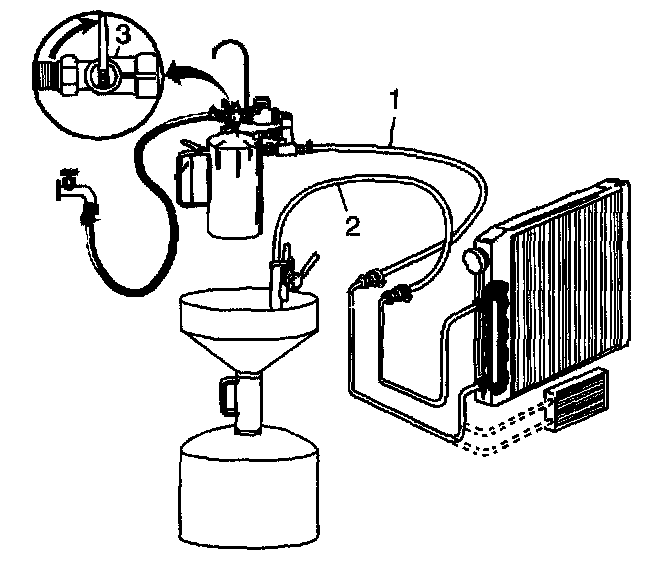 5. Turn the J 35944-A water supply valve (3) to the ON position and allow water to flow through the oil cooler and pipes for 10 seconds to remove any remaining transmission fluid. If water does not flow through the oil cooler and pipes, the cause of the blockage must be diagnosed and the plugged component must be repaired or replaced. Continue with the cooler flushing and flow check procedure once the blockage is corrected.