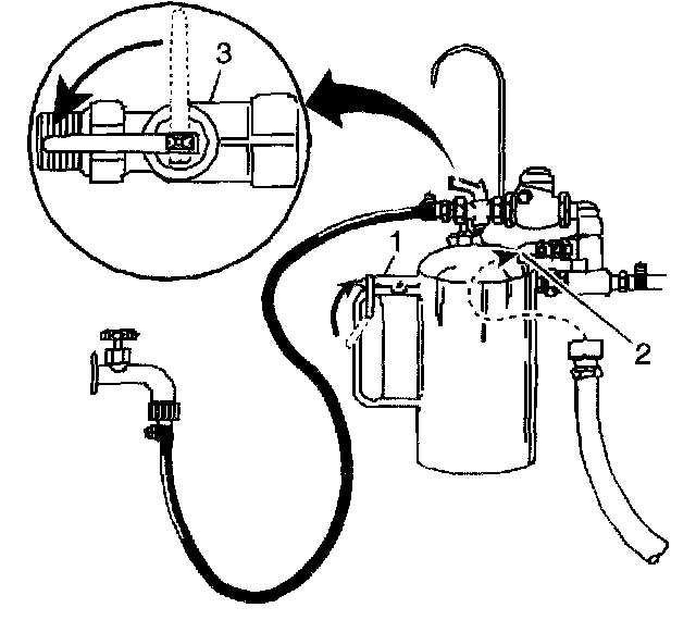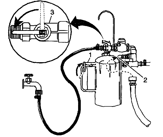 6. Turn the J 35944-A water supply valve (3) to the OFF position and clip the discharge hose onto a 19 liter (5 gallon) pail with a lid, to avoid splash back.