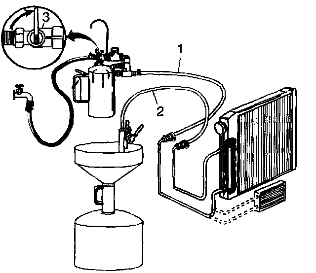 7. Turn the J 35944-A water supply valve (3) to the ON position and depress the trigger (1) to mix cooler flushing solution into the water flow. Use the clip provided on the handle to hold the trigger (1) down. The discharge will foam vigorously when the solution is introduced into the water stream.