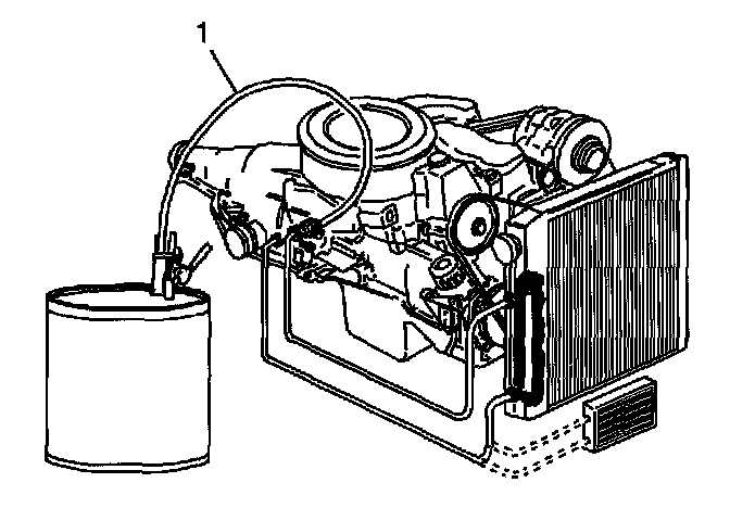 4. Attach the J 35944-A to the undercarriage of the vehicle with the hook provided and connect the flushing system feed supply hose (1) from the J 35944-A to the top connector oil cooler return pipe. Use the J 35944-200, if required.