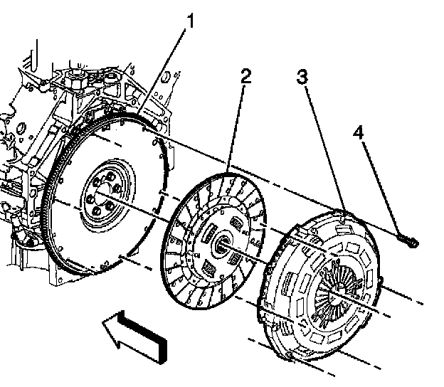 1. Install the clutch pressure plate (3) and driven plate (2) to the dowel pins on the flywheel (1).