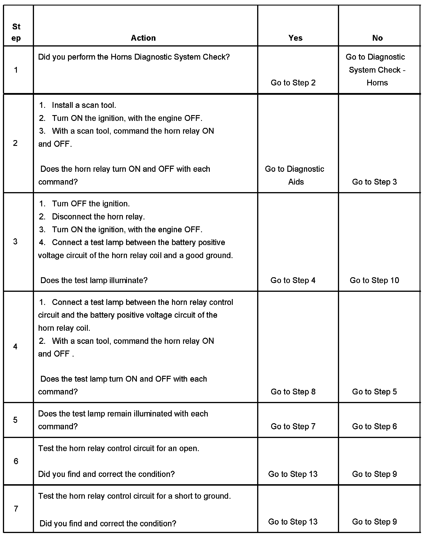 2. Listen for an audible click when the horn relay operates. Command both the ON and OFF states. Repeat the commands as necessary.