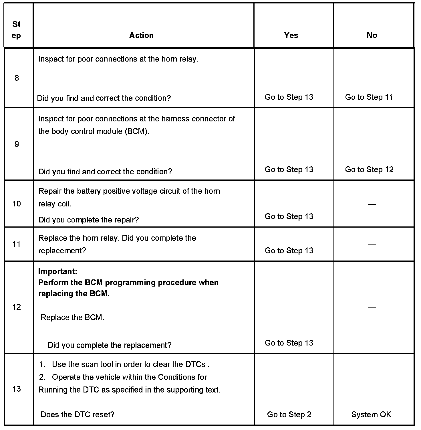 The numbers below refer to the step numbers on the diagnostic table.