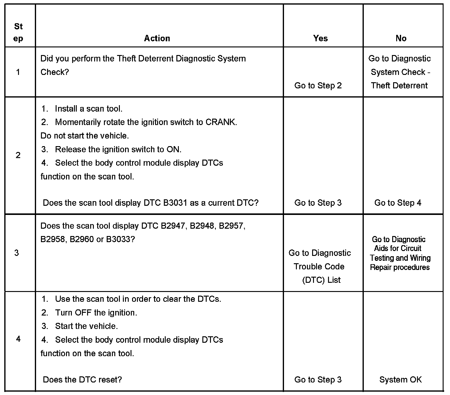 - If DTC B3031 is set in the BCM as a history DTC, clear the DTC and recheck the system. A history DTC B3031 indicates that the BCM has successfully completed the programming mode.