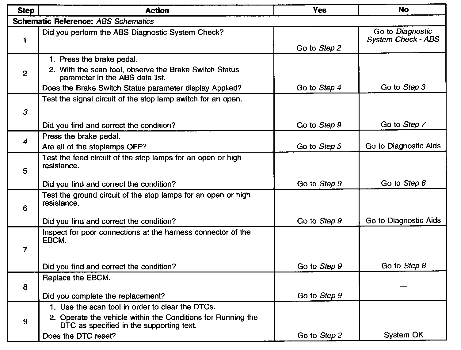 4. The EBCM sources 5 volts on the stop lamp switch signal circuit. This small voltage has a ground path through the stop lamp bulbs. This DTC sets if the path to ground is open.