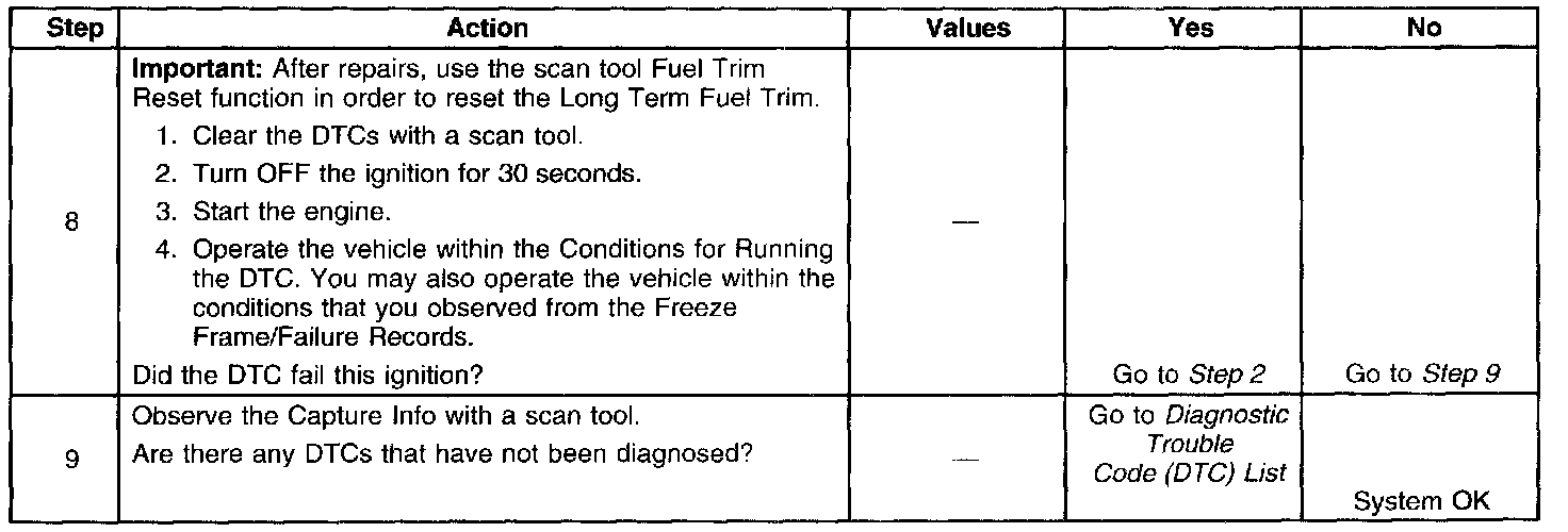 7. An EVAP canister that is saturated will cause a rich condition. Fuel in the vacuum line to the fuel pressure regulator indicates a bad regulator. If conditions were not corrected, a worn cam, worn intake or exhaust valves or other engine mechanical failure may be at fault.