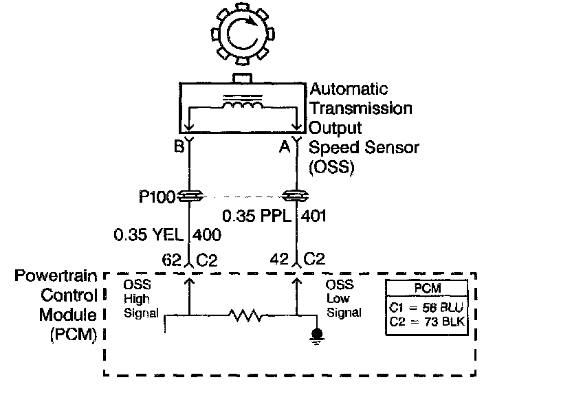 The automatic transmission Output Speed Sensor (OSS) provides vehicle speed information to the Powertrain Control Module (PCM). The OSS is a permanent magnet generator mounted to the transmission case. The OSS produces an AC voltage as the transmission speed sensor rotor teeth pass through the sensor's magnetic field. The AC voltage level increases as the speed of the vehicle increases. The PCM converts the AC voltage into a digital signal. The PCM uses the vehicle speed signal to determine shift timing, Torque Converter Clutch (TCC)apply, TCC release, and gear ratio calculations.