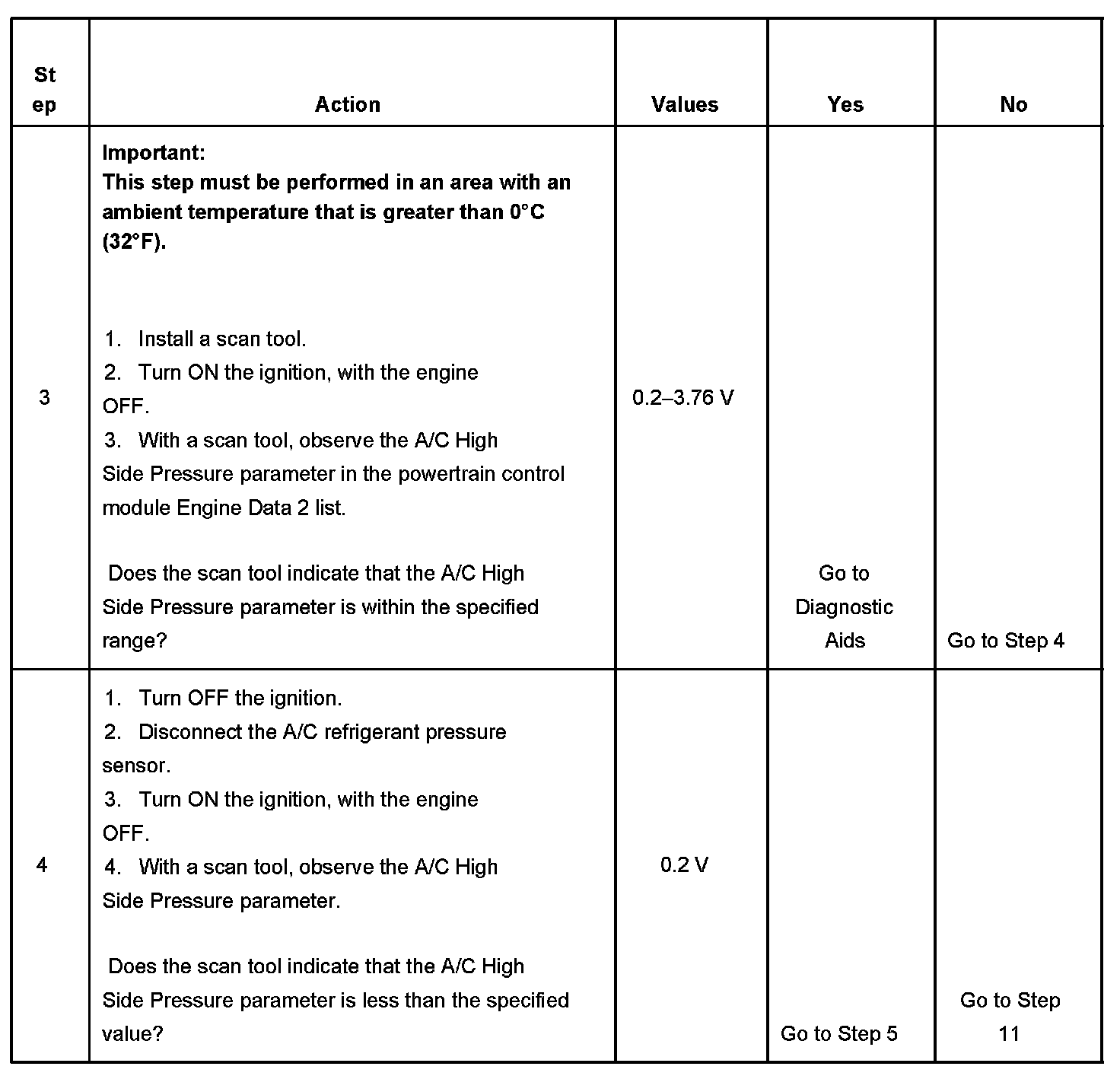 The powertrain control module (PCM) monitors the high side refrigerant pressure via an A/C refrigerant pressure sensor. The A/C refrigerant pressure sensor is a 3 wire piezoelectric pressure transducer. A 5-volt reference, low reference, and signal circuits enable the sensor to operate. The A/C pressure signal can be between 0-5 volts. When the A/C refrigerant pressure is low, the signal value is near 0 volts. When the A/C refrigerant pressure is high, the signal value is near 5 volts.
