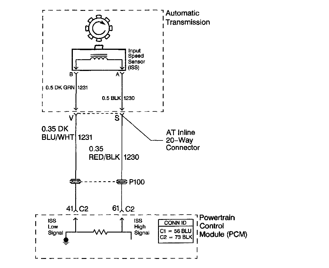 The automatic transmission Input Speed Sensor (ISS) provides transmission input speed to the Powertrain Control Module (PCM). The ISS is a permanent magnet generator. The sensor mounts into the transmission case and maintains a slight air gap between the sensor and the drive sprocket. The ISS produces an AC voltage as the drive sprocket rotor teeth pass through the magnetic field of the sensor. The AC voltage level increases as the turbine shaft speed increases. The PCM converts the AC voltage into a digital signal. The PCM determines actual turbine speed using the digital signal. The PCM uses the input speed to calculate torque converter slip speed, and gear ratios.