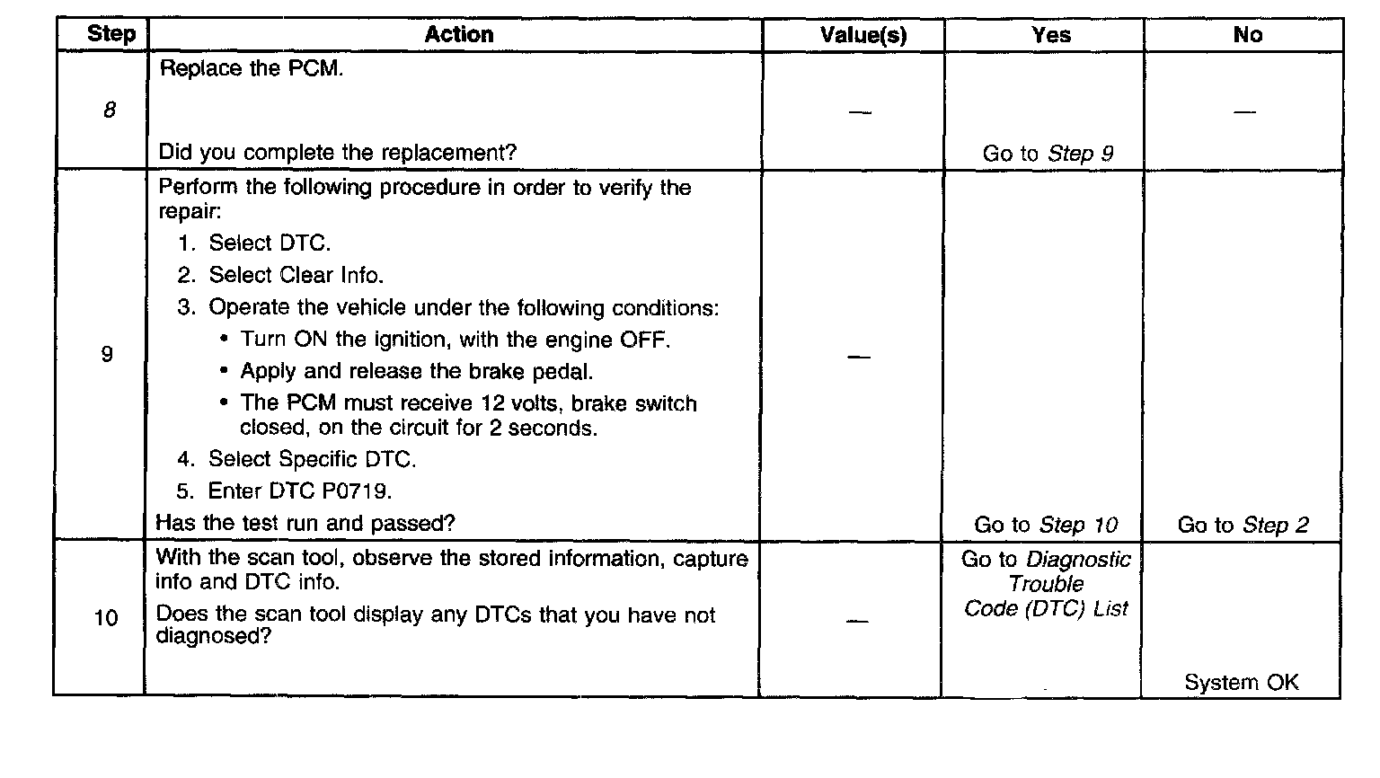 When the PCM detects an open brake switch, stuck ON, during accelerations, then DTC P0719 sets. DTC P0719is a type C DTC.
