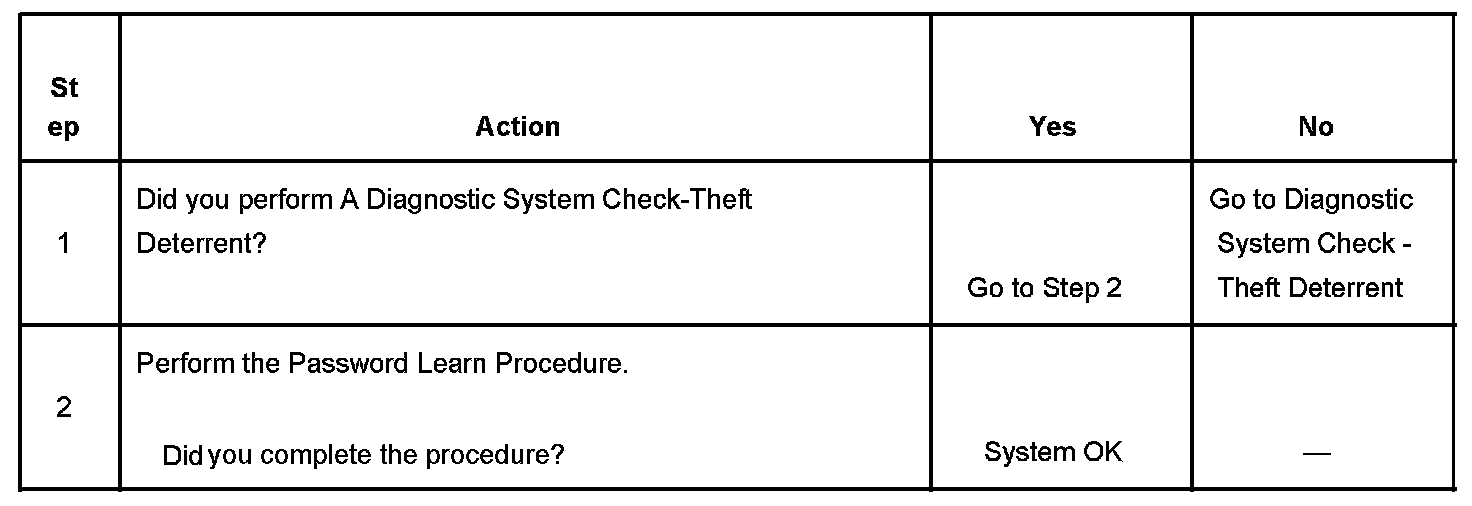 The powertrain control module (PCM) controls the fuel injector operation based on a vehicle theft deterrent (VTD) password from the vehicle body control module (BCM). When the ignition is first turned ON, the BCM sends a programmed theft deterrent password to the PCM. The PCM acknowledges the password and responds to the BCM that normal fuel injector operation will continue. If the PCM detects an incorrect password, a theft deterrent system failure, or an attempted vehicle theft, DTC P1631 will set. The engine will not start as long as the condition is present.