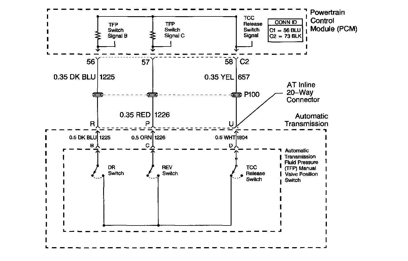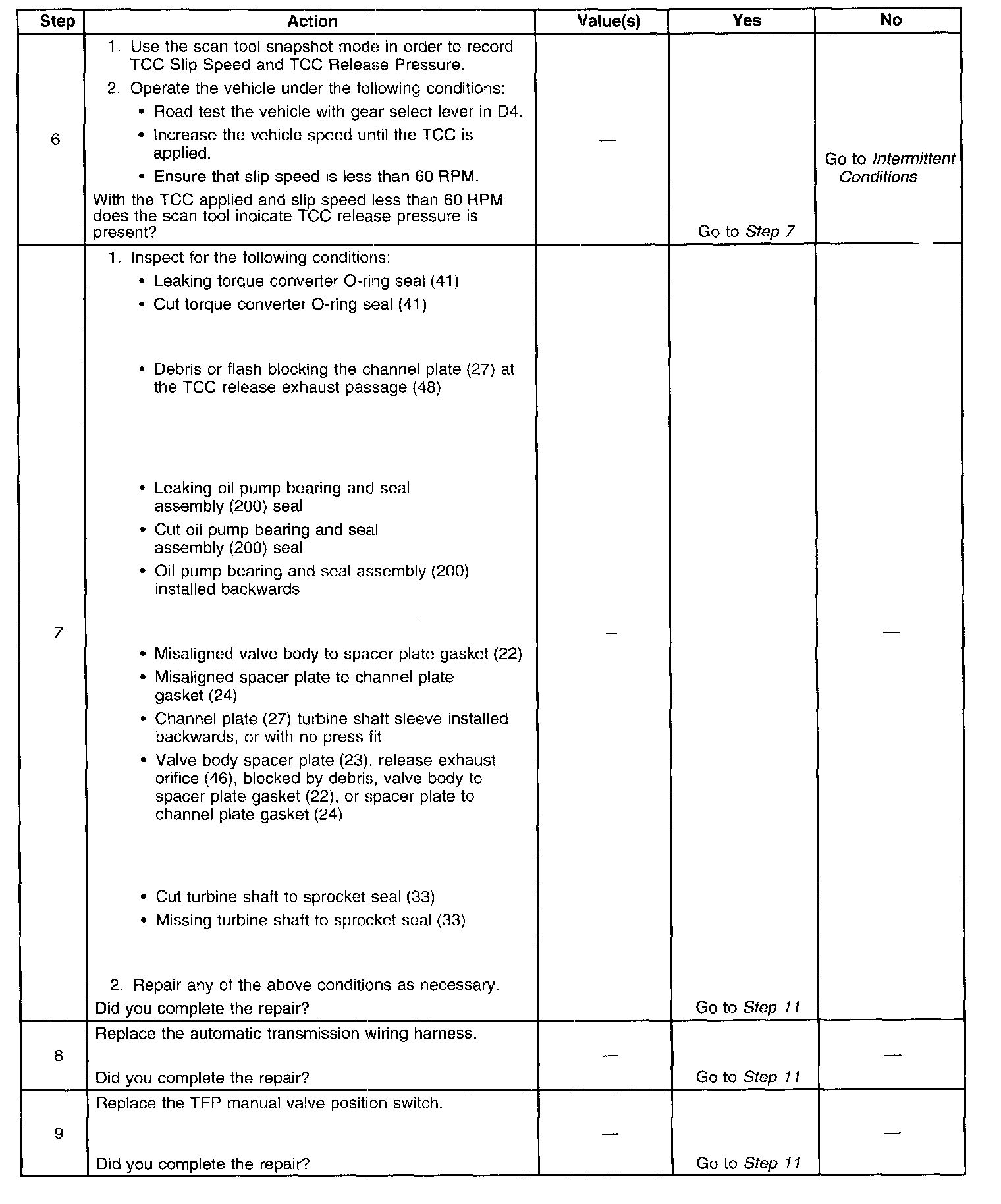 The Torque Converter Clutch (TCC) release switch is part of the automatic Transmission Fluid Pressure (TFP) manual valve position switch. The TFP manual valve position switch is attached to the control valve body. The TCC release switch is normally-closed. The switch signals the Powertrain Control Module (PCM) that the TCC is released. This is accomplished by torque converter release fluid pressure acting on the switch contact, thus opening the switch. When the voltage is high on the circuit, the PCM recognizes that the TCC is no longer engaged. When the PCM determines that the TCC release switch is open, indicating that the TCC is not applied, and the TCC slip speed indicates that the TCC is applied, then DTC P1887 sets. DTC P1887is a type B DTC.