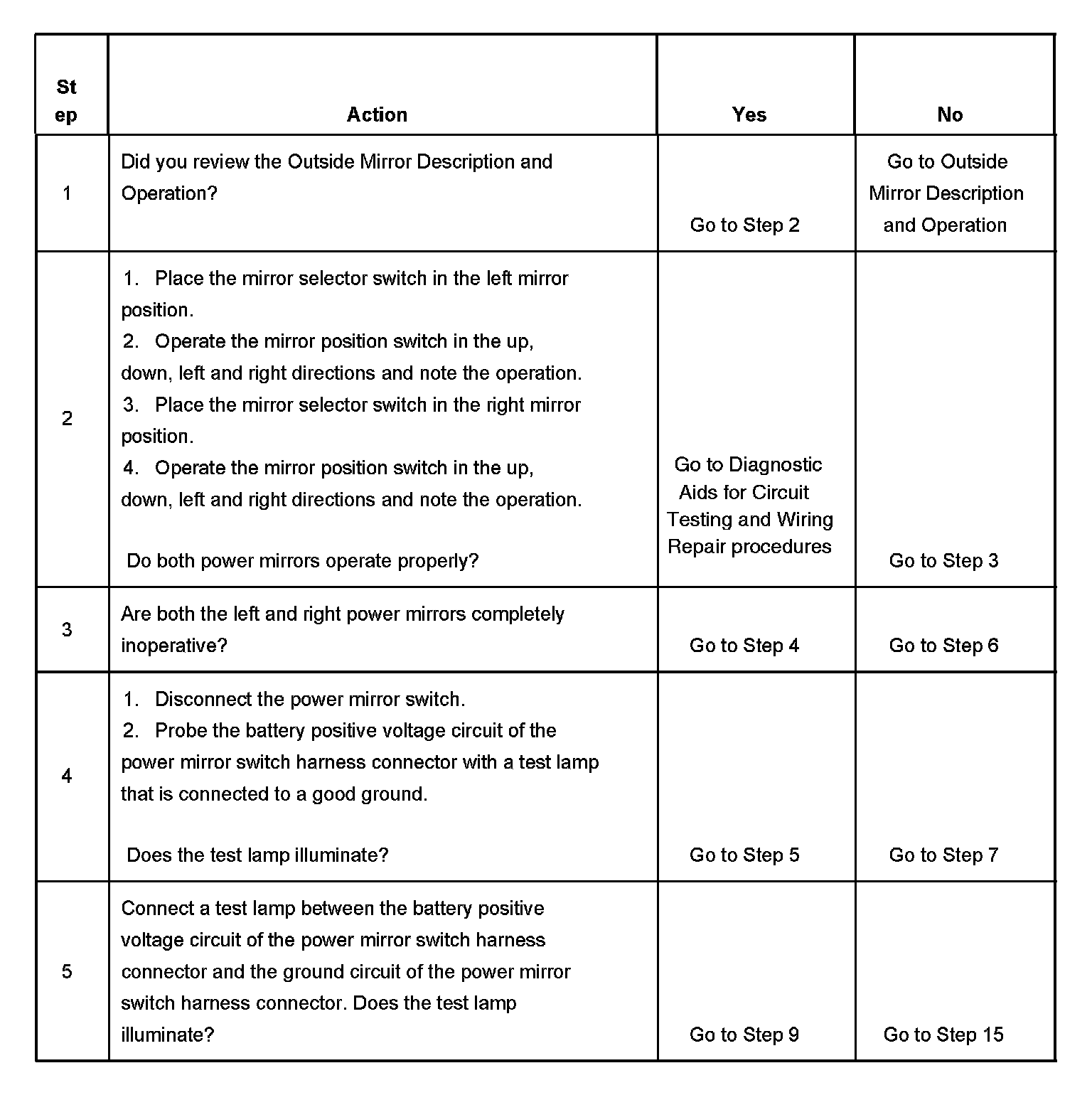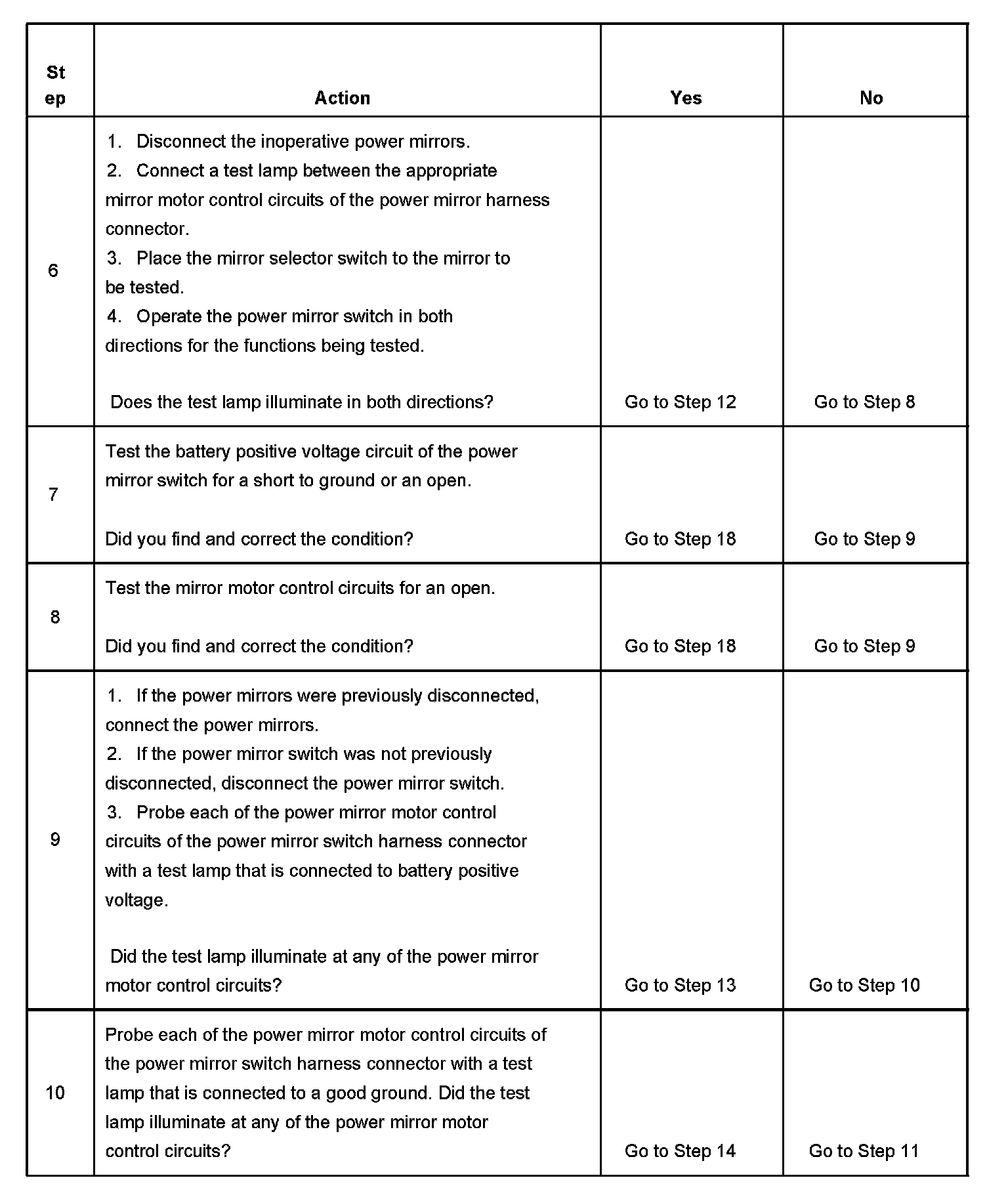 6. This step tests the integrity of both the mirror control circuits and the power mirror switch. If both power mirrors are inoperative on one or more axis, begin testing by disconnecting one of the power mirrors, if an open circuit is detected and repaired for that power mirror, repeat step 6 for the other power mirror.