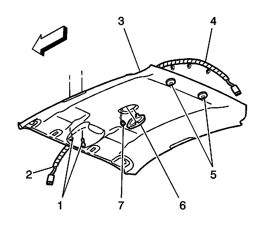 12. Disconnect the headliner wire harness connector (1) located on the upper left quarter panel.