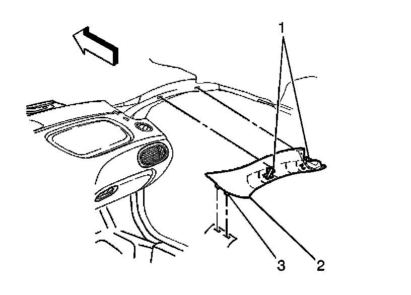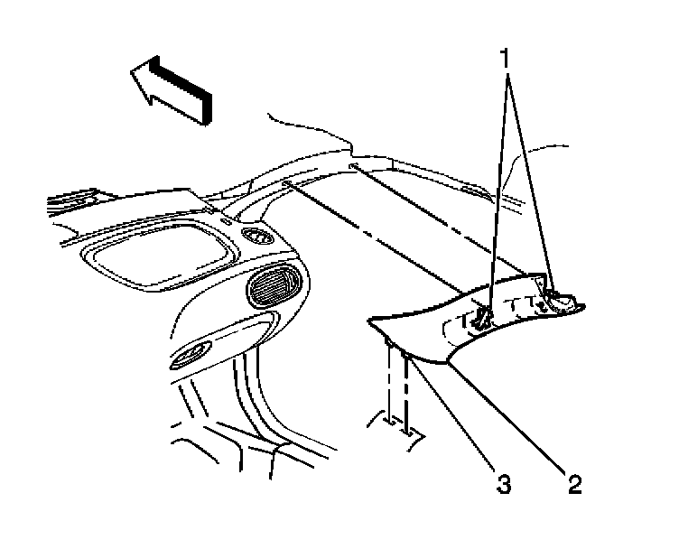 2. Pull on the garnish molding to disengage the clips (1) from the windshield pillar.