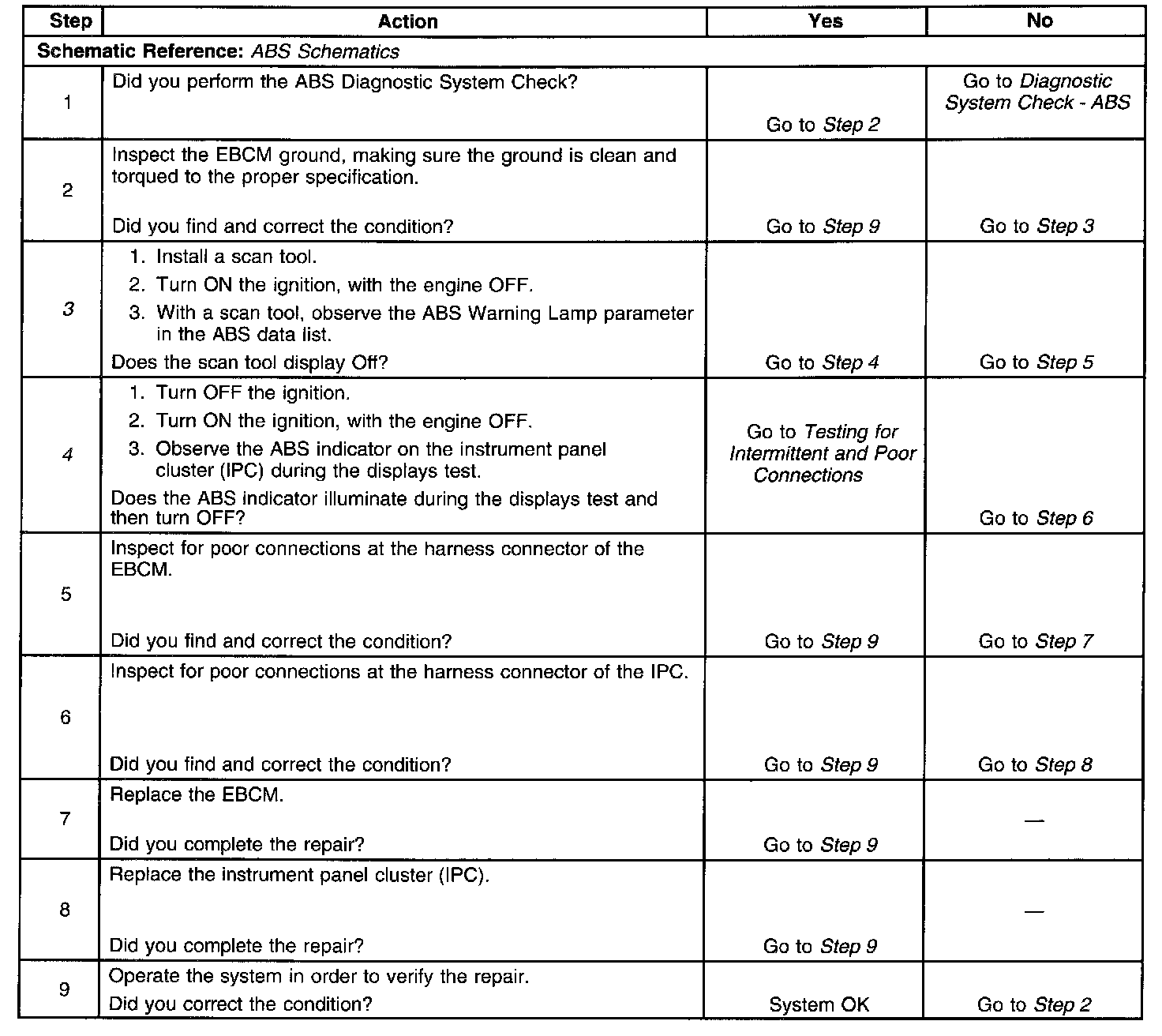 The instrument cluster controls the operation of the ABS indicator. The EBCM reports the desired status of the ABS indicator via serial data messages.