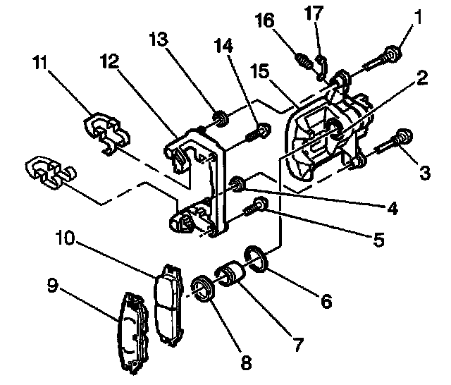 5. Remove the disc brake pad retainers (11) from the disc brake caliper bracket.