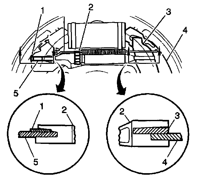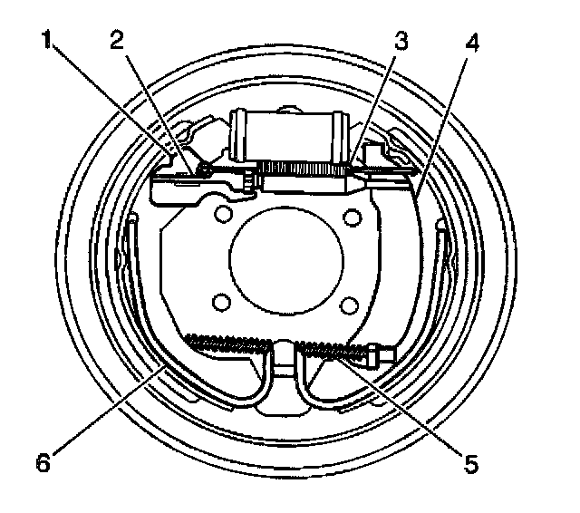 Important: Ensure that the adjuster (2) engages the brake shoes (4 and 5), the park brake actuator (3), and the adjuster actuator (1) properly.