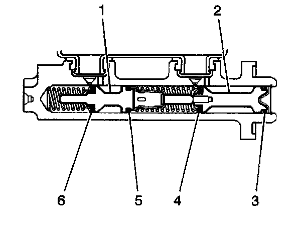 9. Plug the cylinder inlet ports and the rear outlet port. Apply low pressure, non lubricated; filtered air into the front outlet port, in order the remove the secondary piston (1) with the primary (6) and secondary (5) seals, and the return spring.