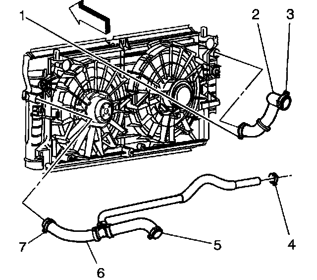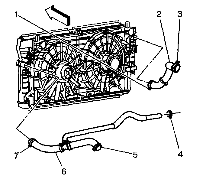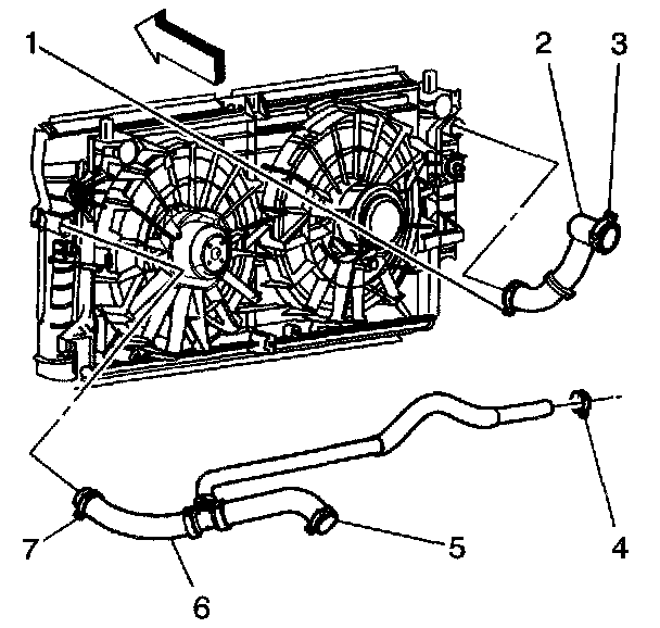 18. Use the J 38185 in order to reposition the surge tank outlet/radiator outlet hose clamp (7) from the radiator.