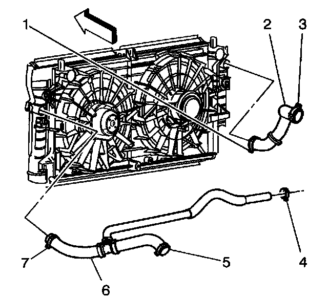 9. Remove the surge tank outlet/radiator outlet hose (6) from surge tank.