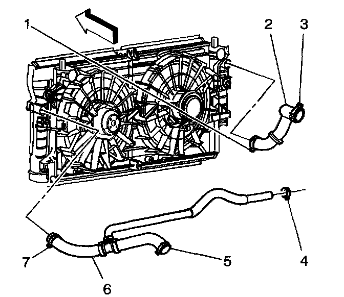 10. Remove the surge tank outlet/radiator outlet hose (6) from the radiator.