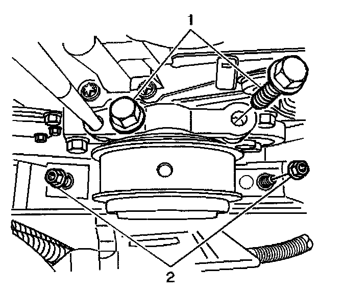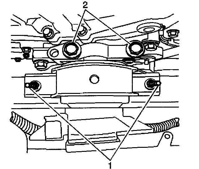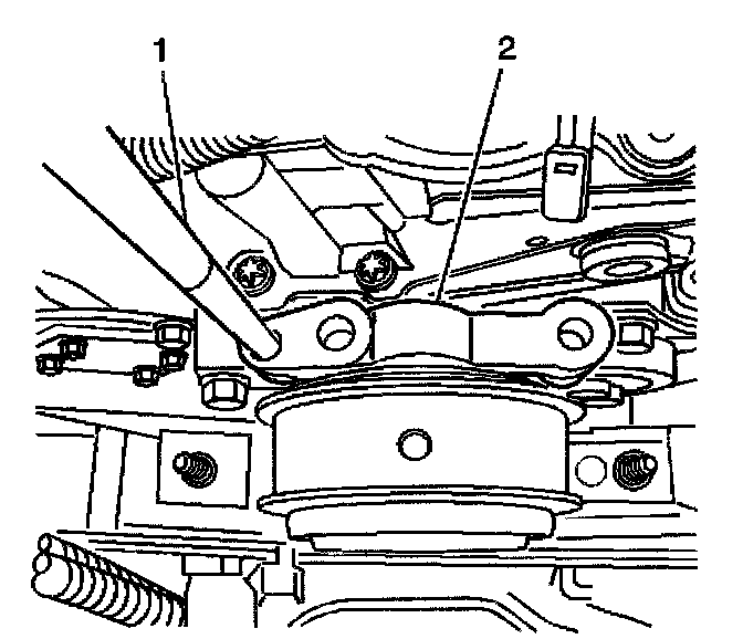 1. Using a dowel (1), align the engine mount (2) to the engine mount bracket.