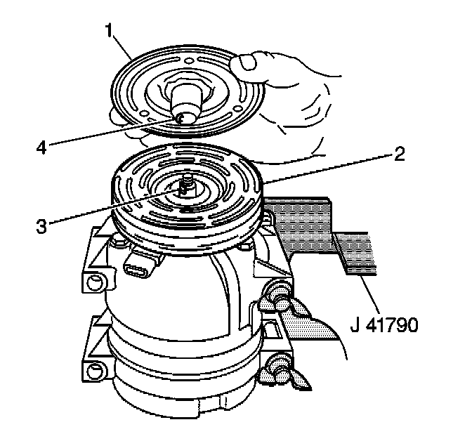 3. Align the shaft key with the shaft keyway in the clutch plate and the hub assembly and place onto the compressor shaft (3).
