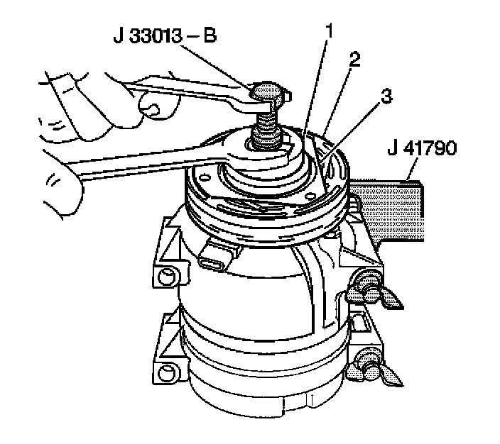 5. Install the J 33013-B and bearing tools (1) onto the clutch plate (3) and the hub assembly (2).