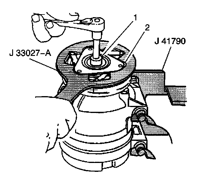 11. Hold the clutch plate and hub assembly (2) with the J 33027-A.