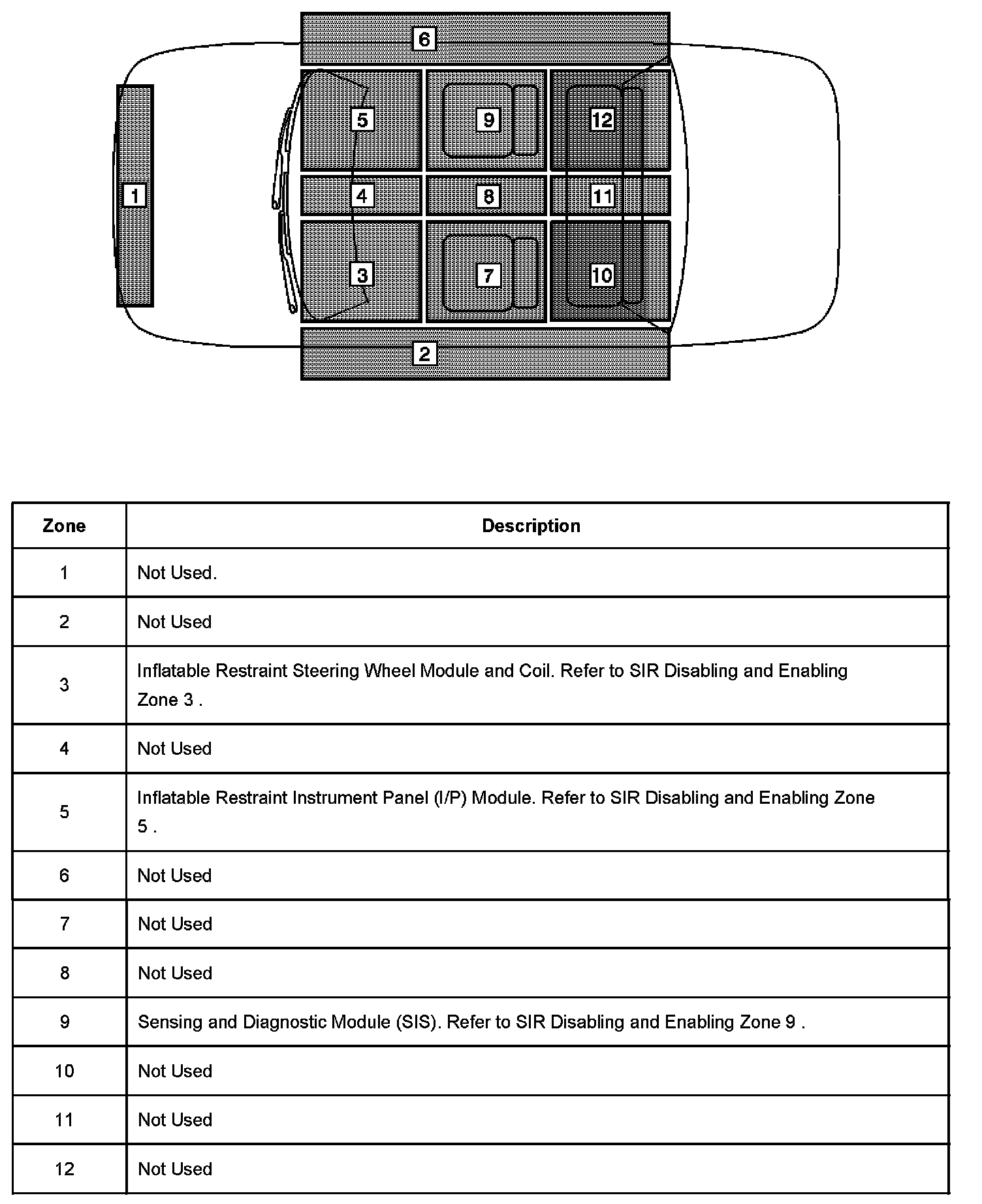It may be necessary to disable more than one zone depending on the location of other SIR components and the area being serviced, refer to SIR Zone Identification Views. Refer to the illustration, to identify the specific zone or zones in which service will be performed.