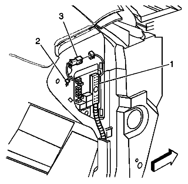 2. Connect the inflatable restraint I/P module connector (3) located above the RH I/P wiring harness junction block.
