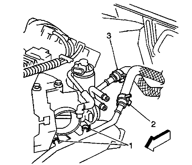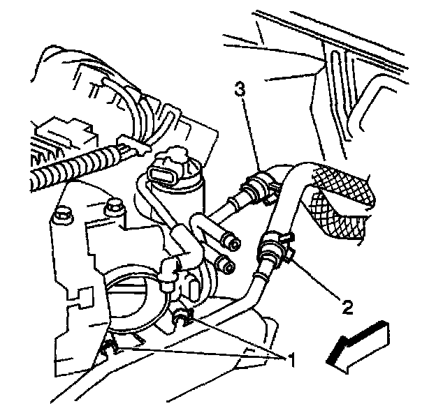 7. Disconnect the throttle body inlet and outlet hoses from the thermostat bypass pipe (1).