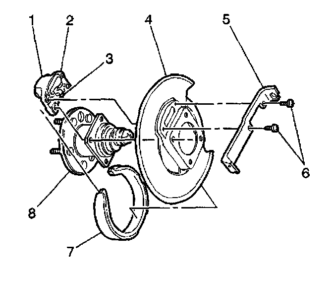 1. Install the wheel hub assembly (8) to the backing plate (4).
