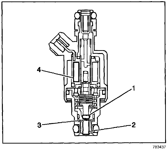 The fuel injector assembly is a solenoid device controlled by the control module that meters pressurized fuel to a single engine cylinder. The control module energizes the high-impedance, 12 ohms, injector solenoid (4) to open a normally closed ball valve (1). This allows fuel to flow into the top of the injector, past the ball valve, and through a director plate (3) at the injector outlet. The director plate has machined holes that control the fuel flow, generating a spray of finely atomized fuel at the injector tip (2). Fuel from the injector tip is directed at the intake valve, causing the fuel to become further atomized and vaporized before entering the combustion chamber. This fine atomization improves fuel economy and emissions. The fuel pressure regulator compensates for engine load by increasing fuel pressure as the engine vacuum drops.