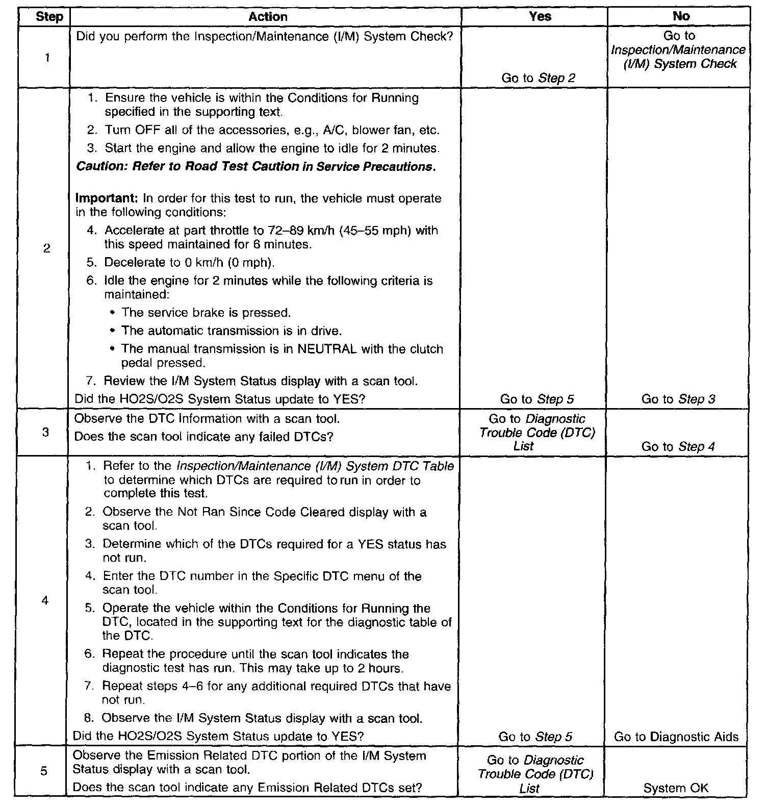 The purpose of this test is to satisfy the enable criteria necessary to execute I/M readiness diagnostics for the oxygen sensor/heated oxygen sensor (O2S/HO2S) system. The test may be used to set the I/M System Status to YES. The I/M System Status Display on the scan tool provides an indication of whether the control module has completed the required tests. The I/M System Status does not indicate that the tests have passed or failed. When all of the diagnostics for a specific system have run and passed the I/M System Status will update to YES. If a test for a specific system has failed, the I/M System Status will update to YES, indicating a determination was made, even if all of the other tests for that system have not run.