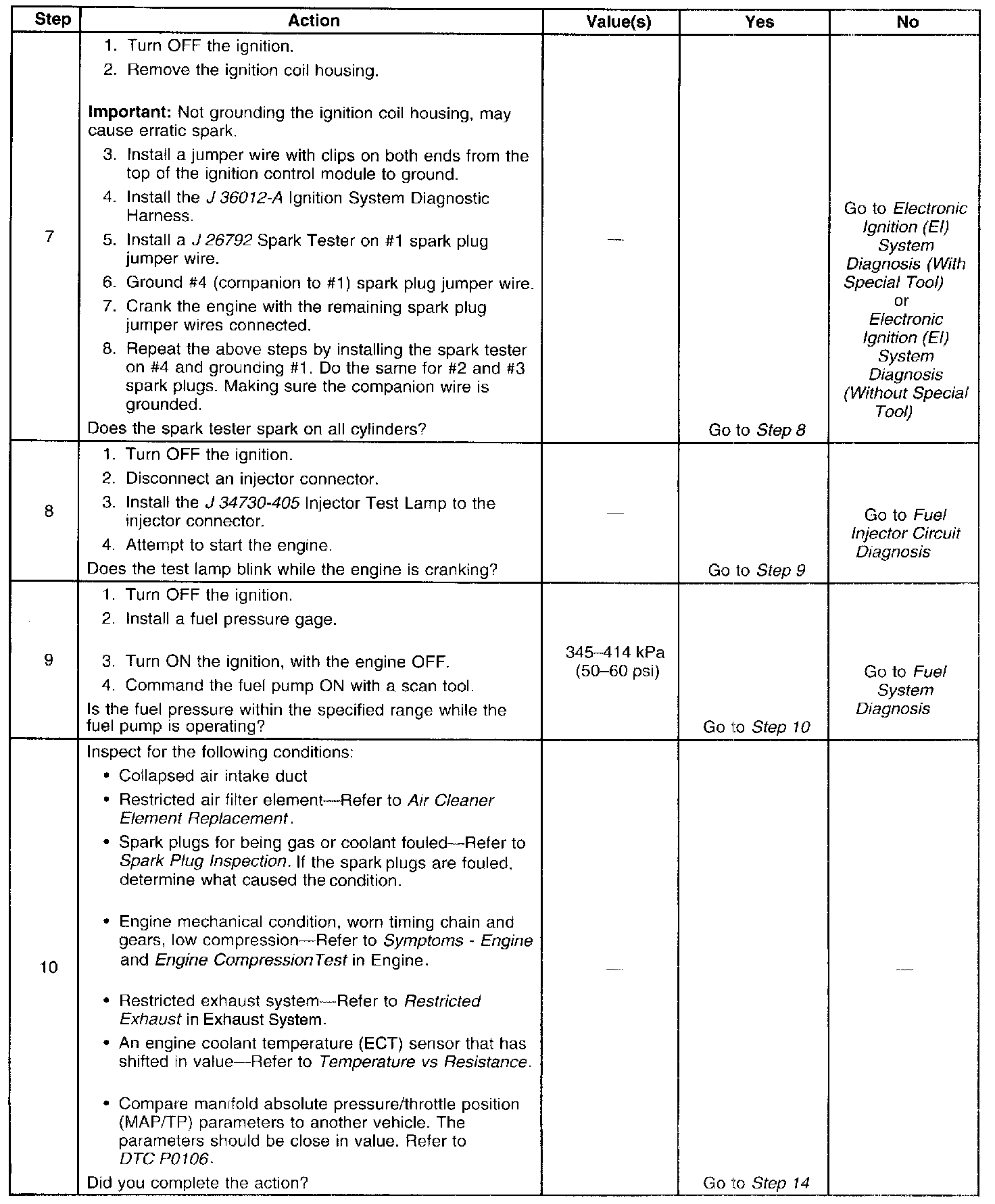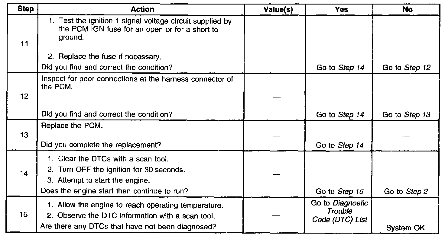 The Engine Cranks but Does Not Run diagnostic table is an organized approach to identifying a condition that causes an engine not to start. The Engine Cranks but Does Not Run diagnostic table directs the service technician to the appropriate system diagnosis. The Engine Cranks but Does Not Run diagnostic table assumes the following: