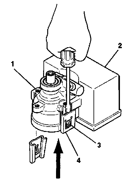4. Slide the reservoir clip (4) away from the hydraulic pump assembly (1).