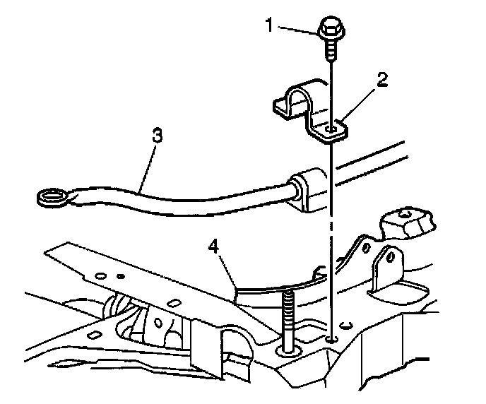 7. Remove the bolts (1) from the clamps (2) attaching the stabilizer shaft (3) to the crossmember (4).