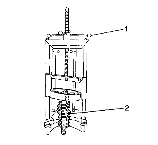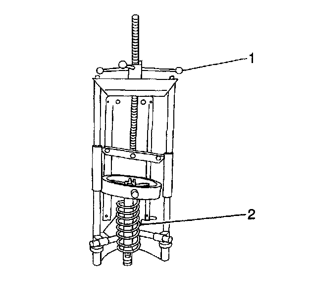 4. Loosen the compressor forcing screw (1) until the upper strut mount and coil spring (2) may be removed.