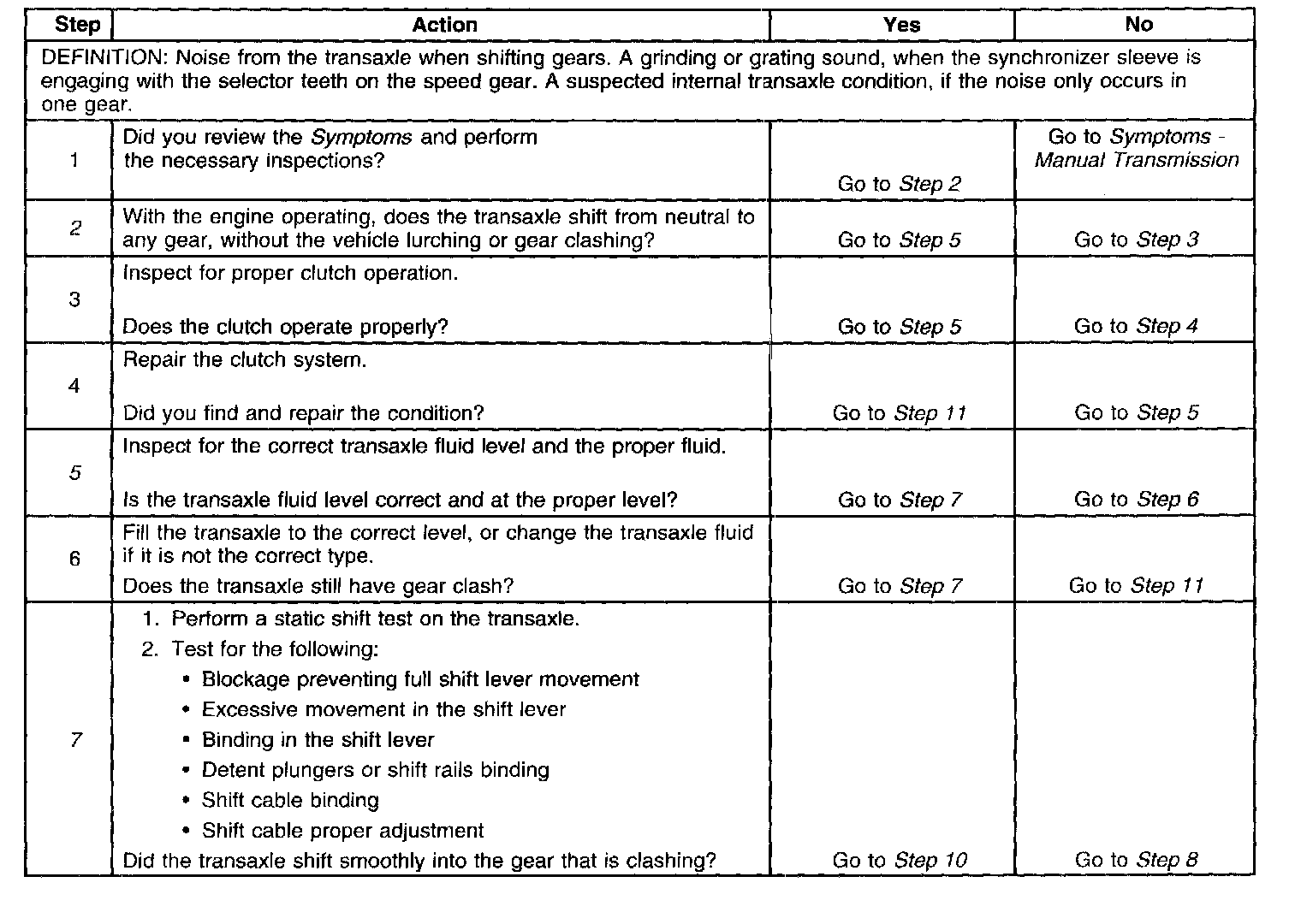 2. This step tests for the proper releasing of the clutch. If the clutch reserve is not proper, the mainshaft gears may still be turning causing the gear clashing.