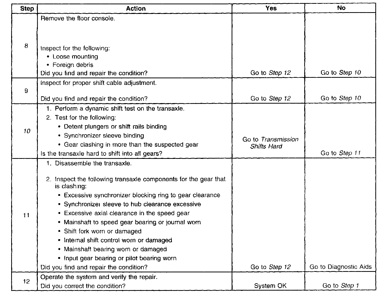10. A dynamic shift test is performed by shifting into all of the gear positions with the engine operating. Test for the correct mesh of the synchronizers, and for the clutch releasing correctly. Move the shift lever and feel for the synchronizer sleeve to just release from the gear, then let up on the clutch pedal. Depress the clutch pedal and move the shift lever to engage that gear again. If it shifts back into the gear without clashing, the clutch is releasing correctly and the synchronizer is working. If clashing occurs, test on another gear. If all gears clash, the clutch is not releasing correctly.