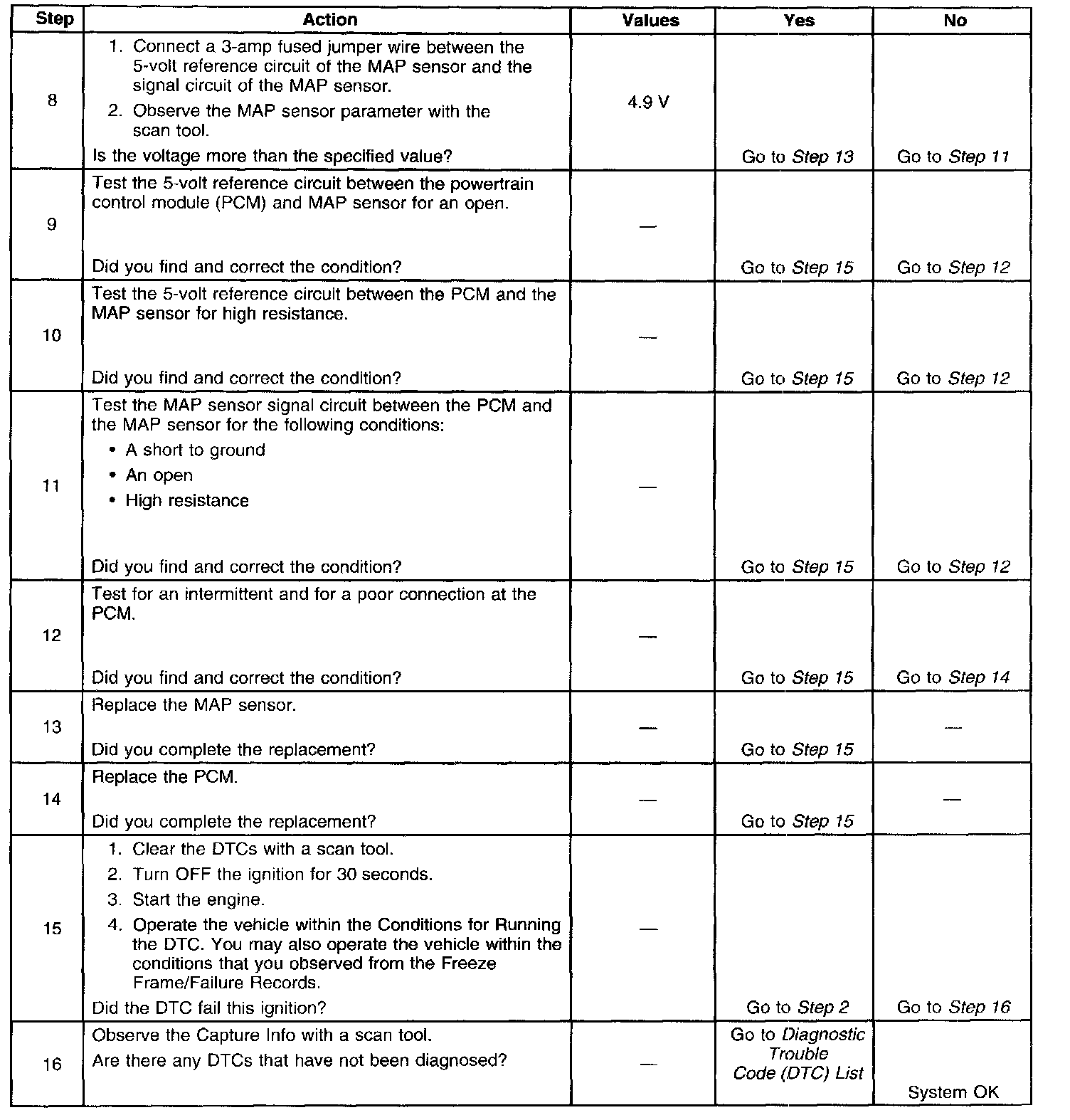 If the PCM detects a MAP sensor signal voltage that is excessively low, DTC P0107 will set.